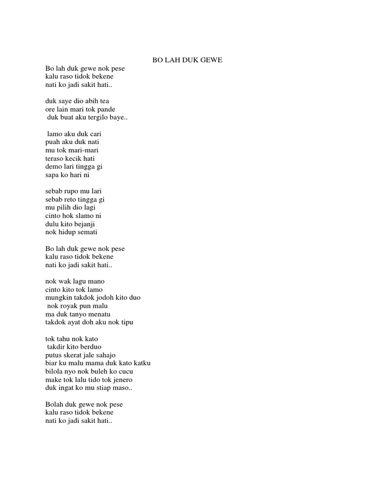 Lirik Lagu Bo lah Duk Gewe - Syahmi Rubin Berikut merupakan Lirik Lagu Bo lah Duk Gewe - Syahmi Rubin. Report bad chords P L A Y 0000 0000. Duk buat aku tergilo baye.
